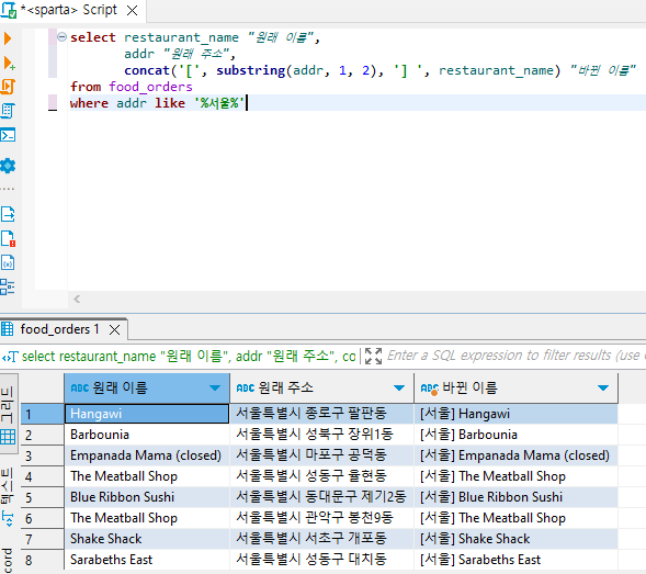 substring(컬럼이름, 시작위치, 글자 수): 시작위치부터 글자수만큼만 나타남