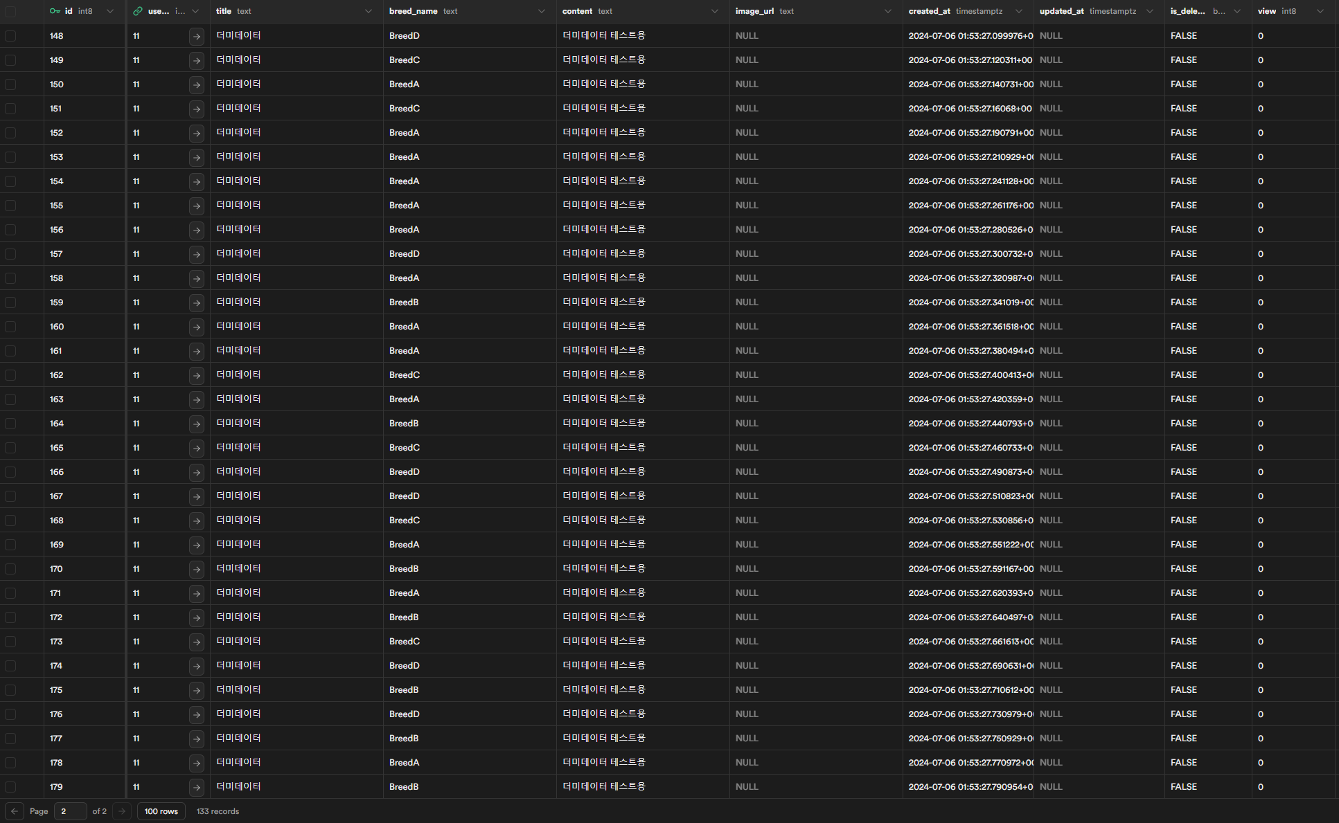 실제 DB에도 100개의 더미데이터가 INSERT된것을 확인할 수있다.