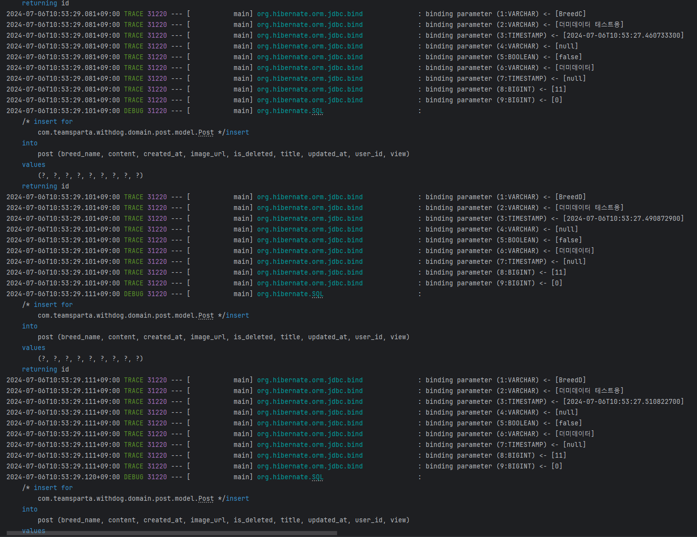더미데이터가 insert되는 쿼리가 발생하게 되고 (100개의 더미데이터니 100개의 쿼리가 발생할 것이다)