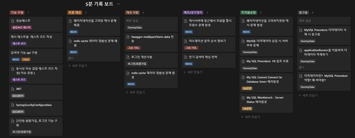 5분 기록 보드를 활용하여 각 주차별, 날짜별 어떤 기능을 구현했는지를 확인이 가능