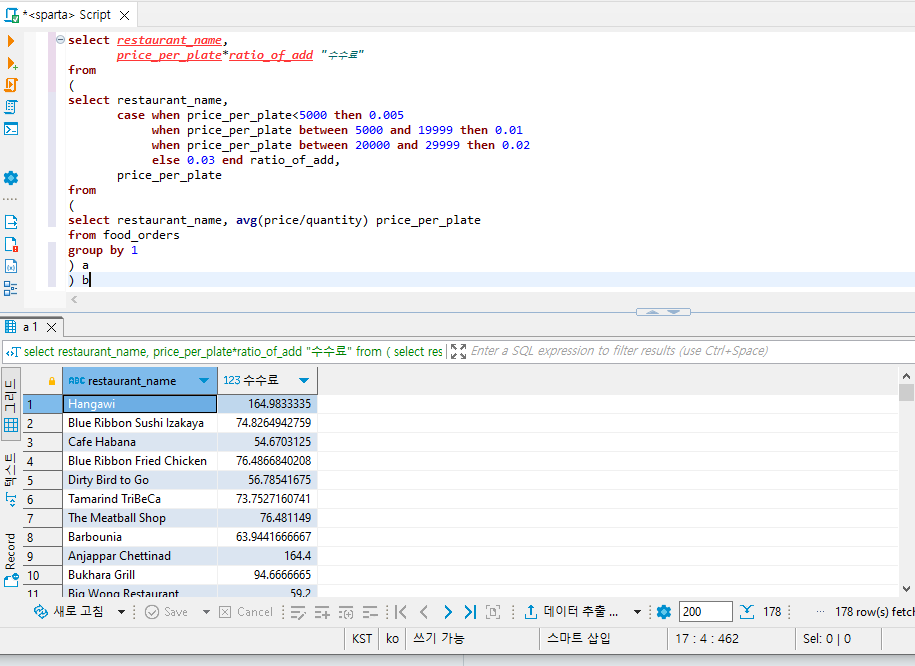 그 서브쿼리를 포함하는 서브쿼리 b 에서 price_per_plate의 값에 따른 값들(0.005,0.01,0.02)을 ratio_of_add 라는 별명으로 넣어준다. 결과적으로 from은 조회하고싶은 테이블을 불러오는것이므로 food_orders-> (restaurant_name,price_per_plate) 순으로 불러와지므로
