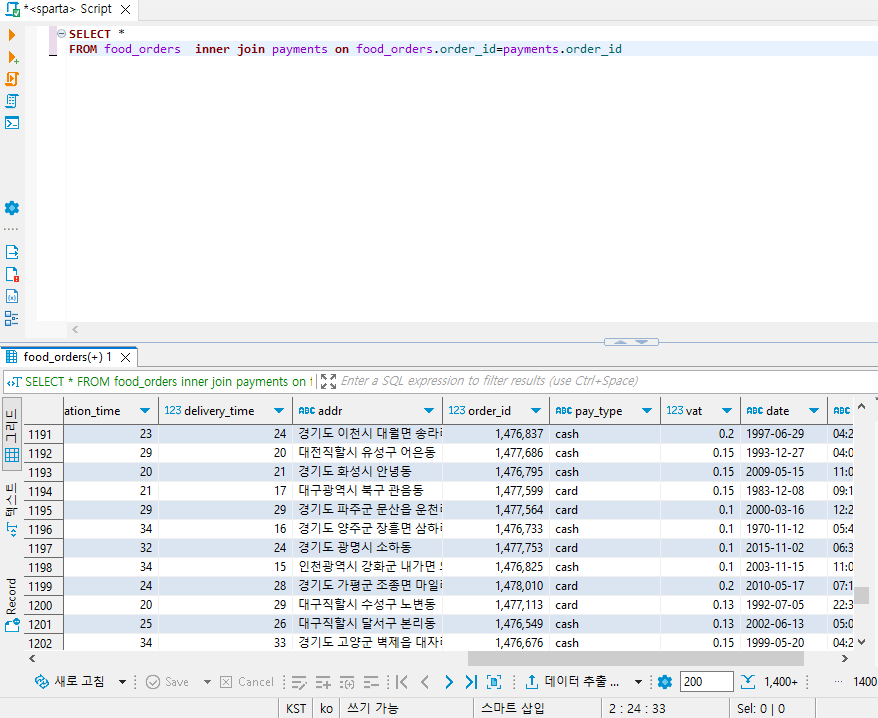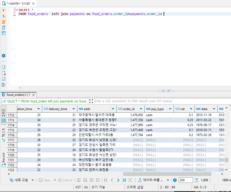 왼쪽에 있는 food_orders 테이블을 orders.id 컬름을 기준으로 payments의 테이블을 합친다. LEFT JOIN을 사용했기때문에 NULL 값이 존재하는것을 알수 있다