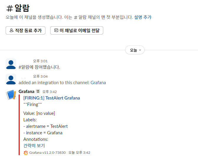 - Grafana의 알림 기능을 사용하여 Slack 등을 통해 팀원들에게 경고 전달이 가능하다