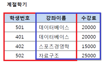 3차 정규화: 비 기본키 끼리의 종속을 제거해야한다. -> A->B, B->C의 형태 이므로 강좌 이름이라는 비 기본키 속성에 수강료가 종속되므로 3차 정규화를 해야한다.