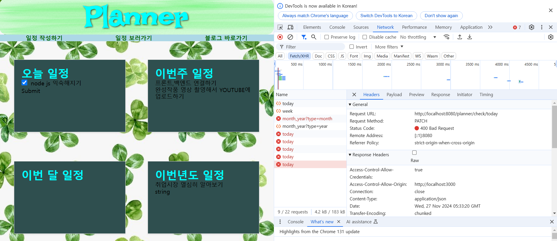 남은 기능은 일정 작성하기의 새로운 페이지(POST API 호출)를 만드는것과 메인페이지 하단에 진행%를 표시하는 기능, 전체 DB를 조회할수 있는 일정 보러가기 페이지의 구현이 남아있다.