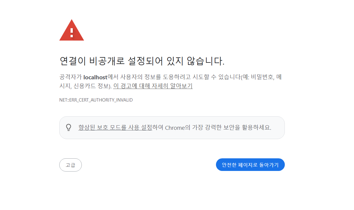 주의 요함이라고 표시가 된 이유는 인증기관(CA)에서 인증받은 인증서가 아닌 자체 서명 인증서이기 때문에 경고 표시가 나오는것이다. 나중에 실서비스를 할때는 CA에서 인증받은 인증서를 사용하거나 AWS에서 관리하는 SSL 인증서를 사용할 예정이다.