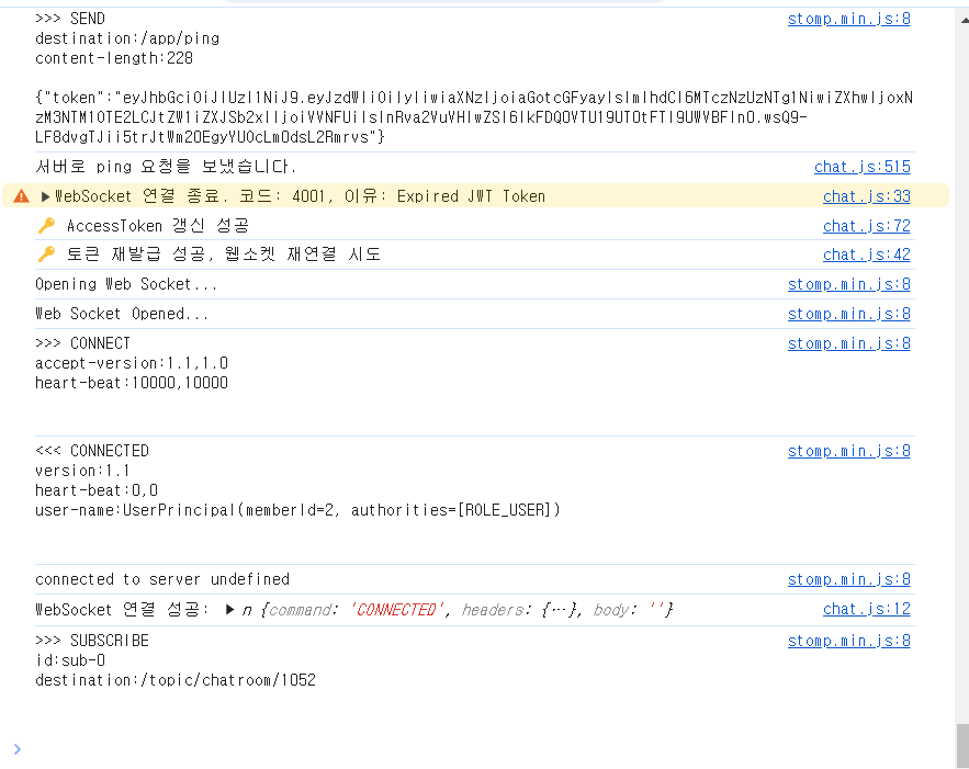 3. 웹소켓 연결이 성공한 후 주기적으로 1분 간격마다 WebSocket의 app/ping 으로 토큰 정보를 담고있는 ping 메세지를 보냄
