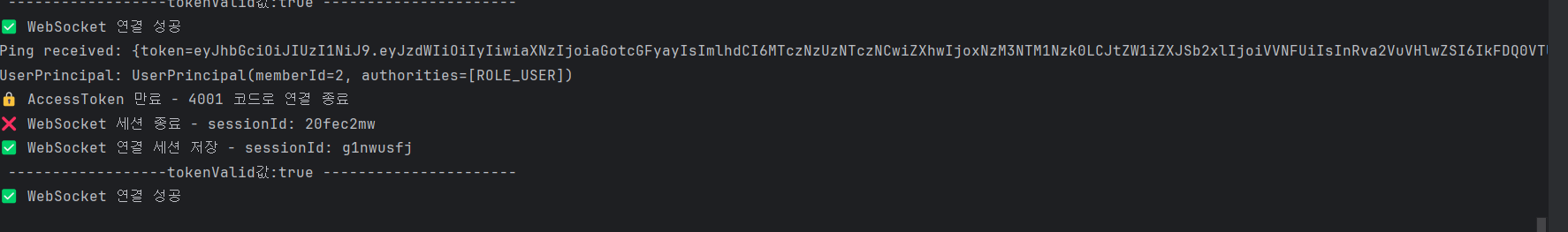 클라이언트가 AccessToken이 담긴 메세지를 ping으로 보내면 해당 토큰을 검증하고 만약 검증에 실패한다면 그 원인이 토큰의 만료기간에 의한것이라면 클라이언트 웹소켓 세션으로 4001 상태코드를 보내 웹소켓 세션을 닫는다.