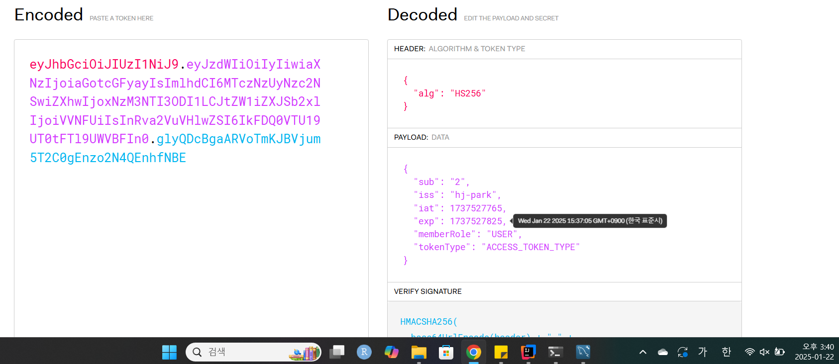 토큰의 만료시간이 지난것을 볼수 있지만