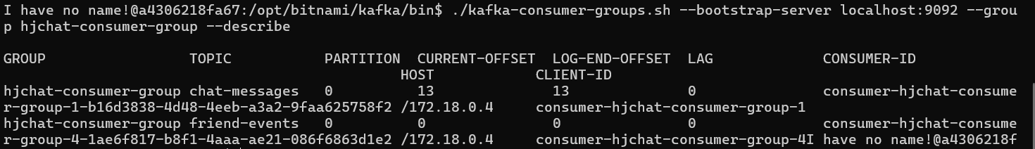 ./kafka-consumer-groups.sh --bootstrap-server localhost:9092 --group hjchat-consumer-group --describe