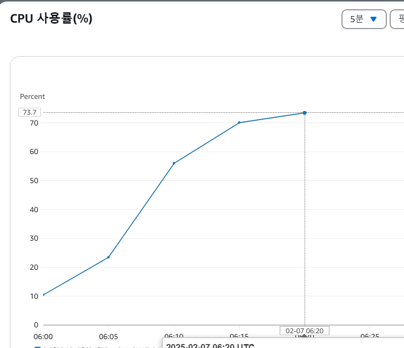 EC2 인스턴스의 모니터링을 해보니 CPU사용량이 갑자기 급증한 상태라는것을 확인할 수 있었다.