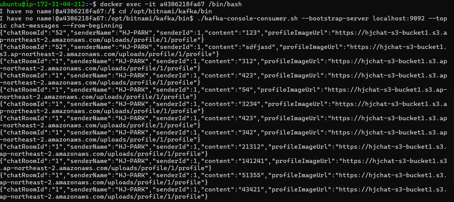 kafka의 chat-messages에서 메세지가 정상적으로 들어오는지 확인
