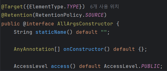 사용 가능한 AccessLevel 값들 : (PROTECTED, PUBLIC, PACKAGE-PRIVATE, PRIVATE)