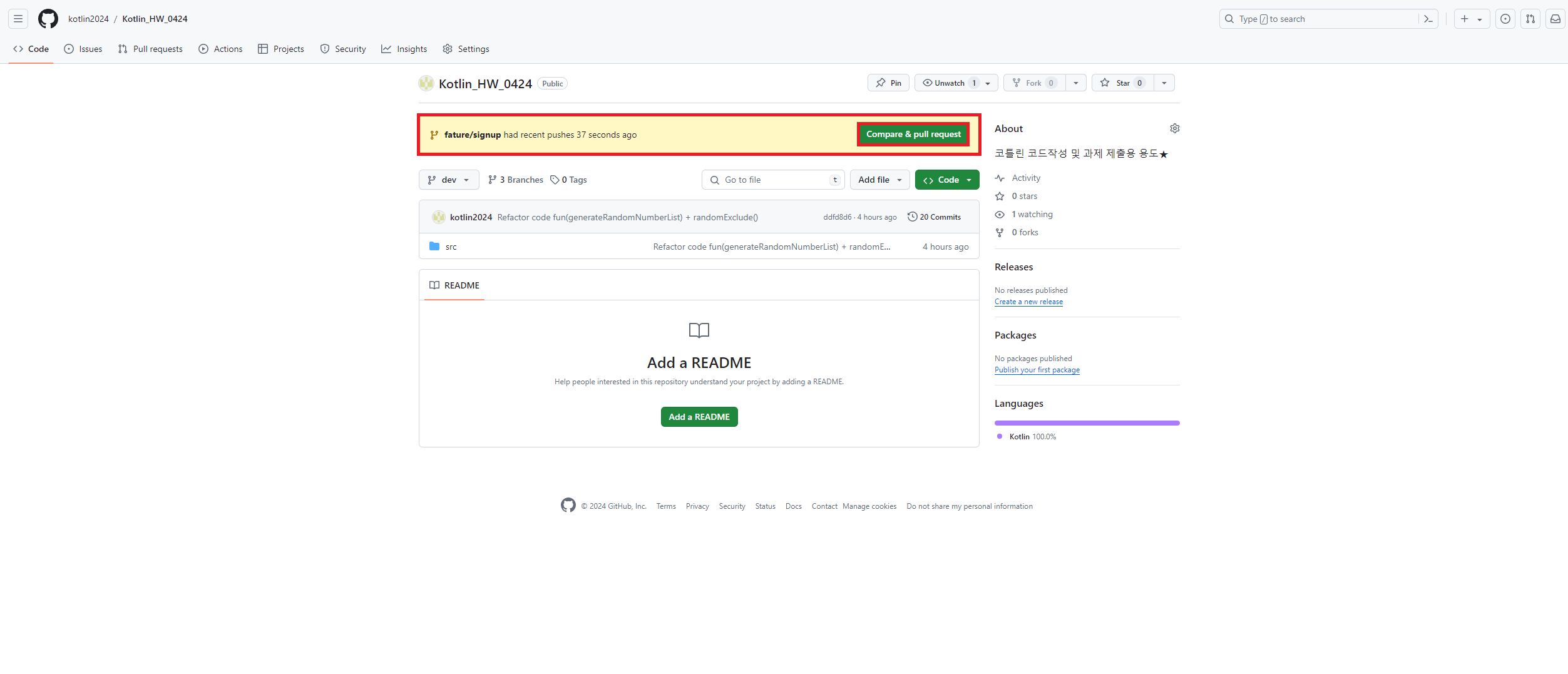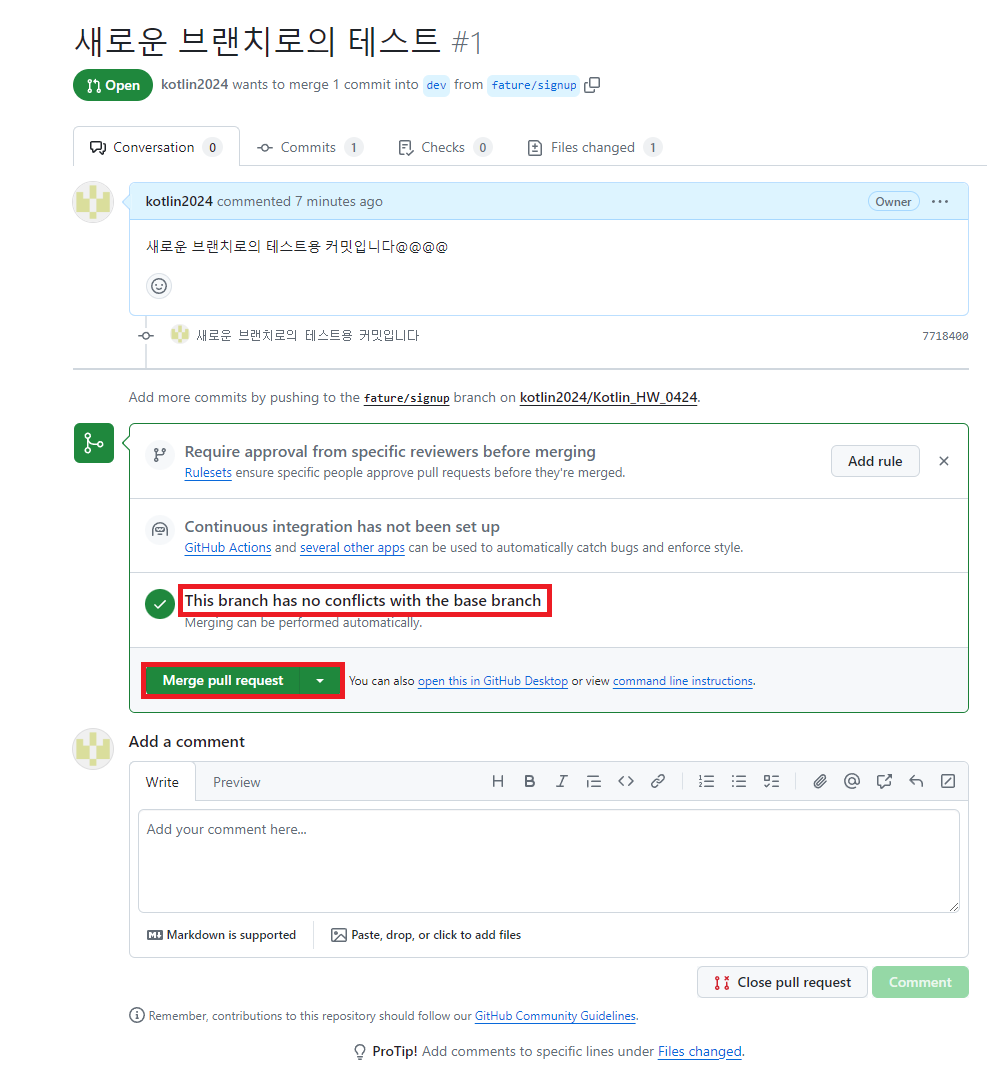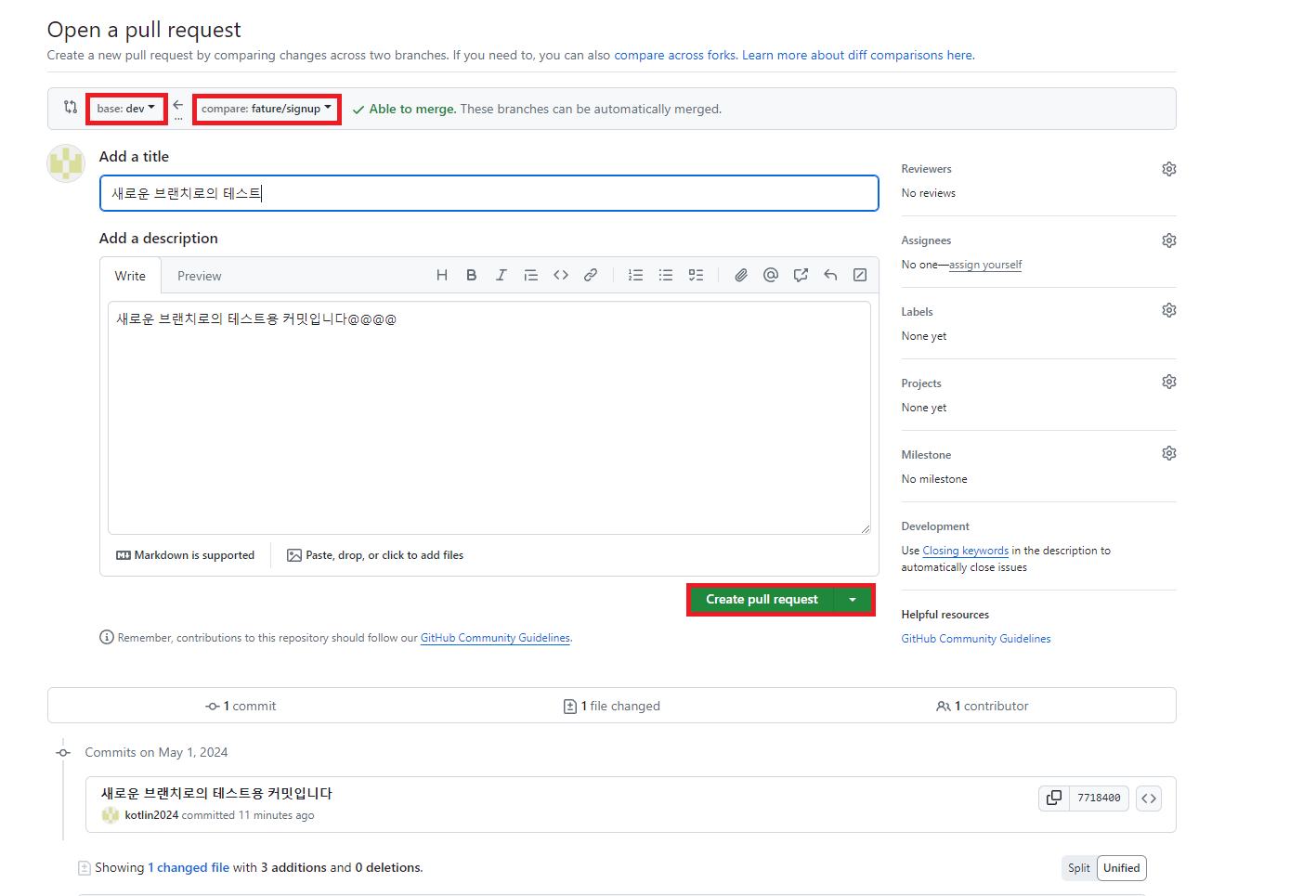 7. pull request생성창에서 base branch와 기능 branch를 확인할 수 있음 (base:dev)