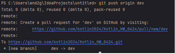 git push origin dev : dev라는 이름의 브랜치로 원격 저장소인 origin에 푸시하는 것을 의미