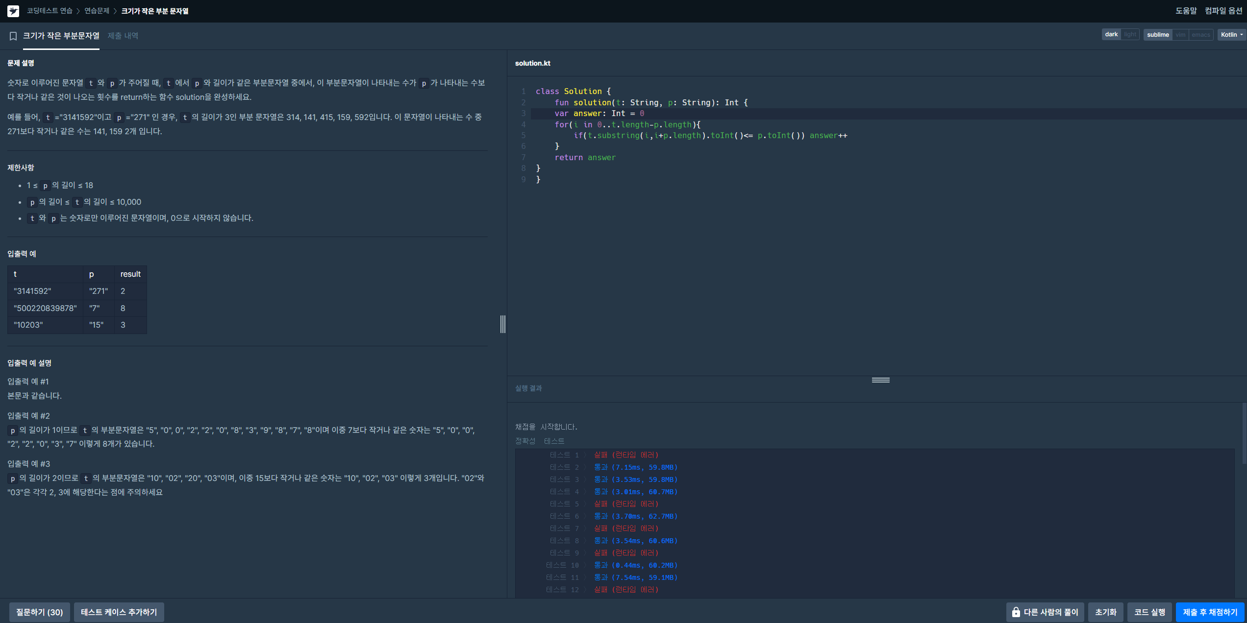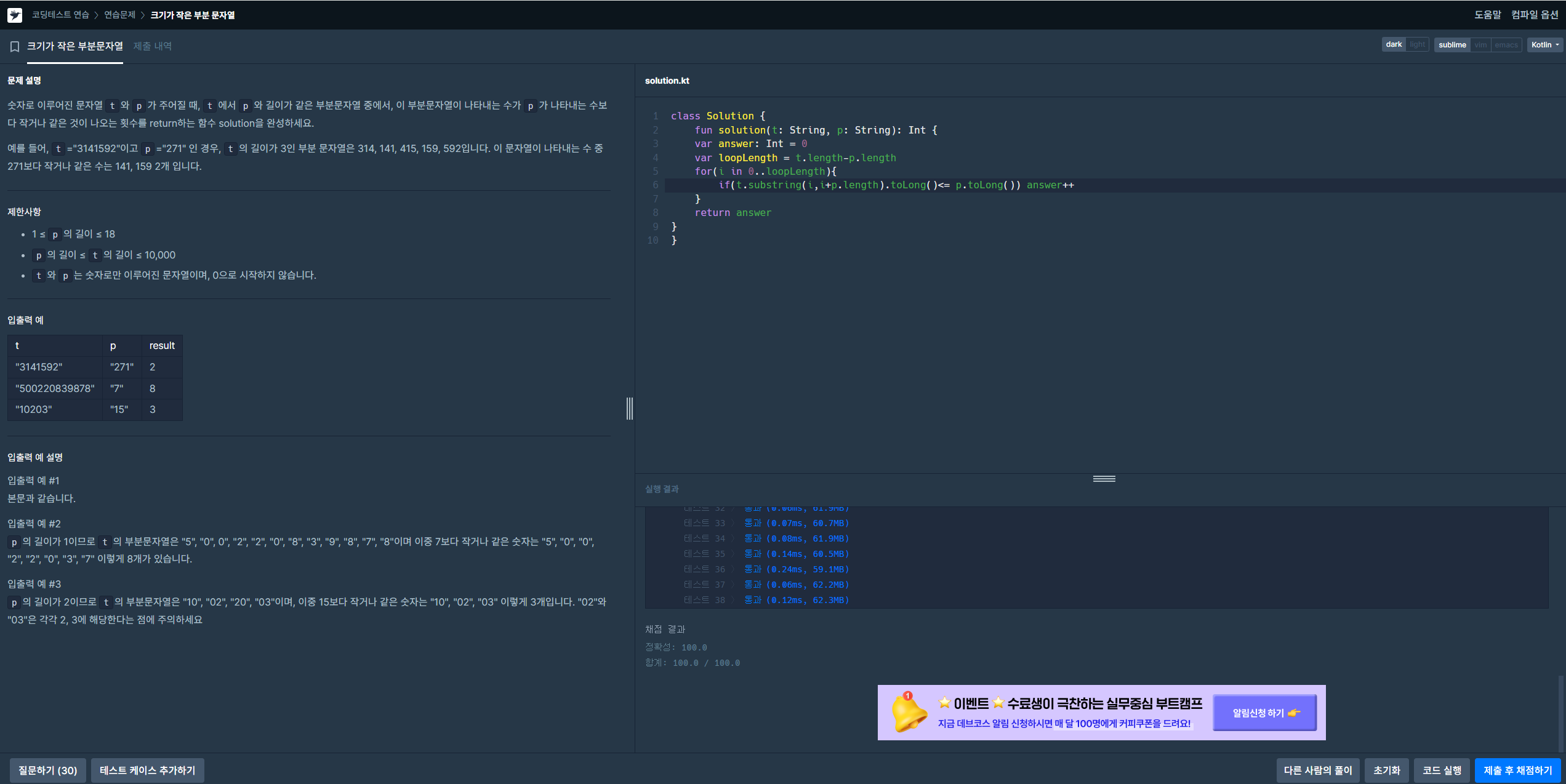 제한사항을 보면 t의 길이는 10000 이하로 되어있으므로 t의 길이가 매우 클경우도 생각해야하기 때문에 Int타입이 아닌 Long타입으로 변환해줘야한다