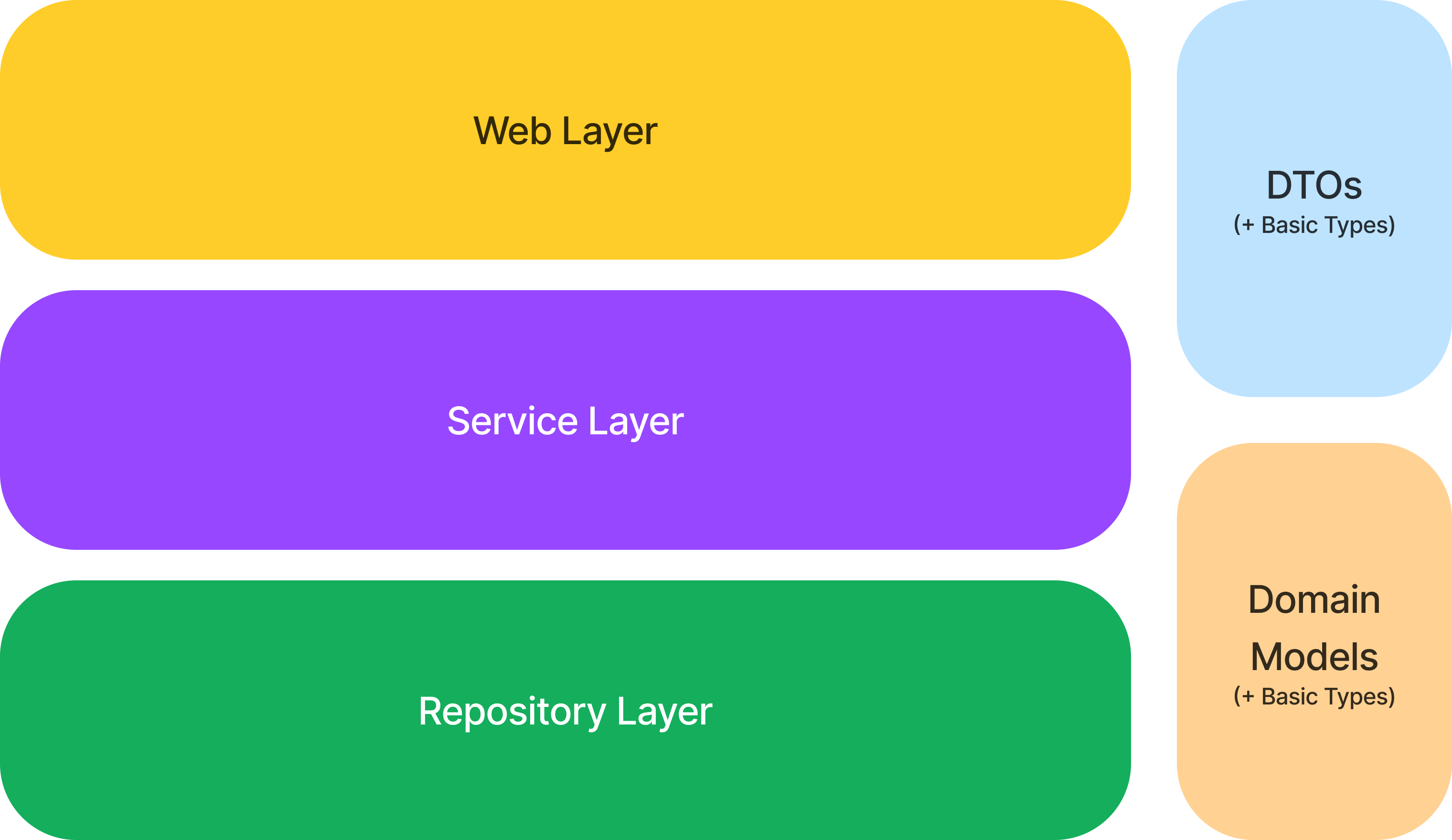 - Spring Web Application구조에서 Web Layer가 객체(데이터)를 받으면 Service Layer로 넘겨주고 Service Layer에서는 Domain Model로 로직을 수행한 다음 그 객체를 다시 Web Layer로 보내는 형태로 구성되어 있다.