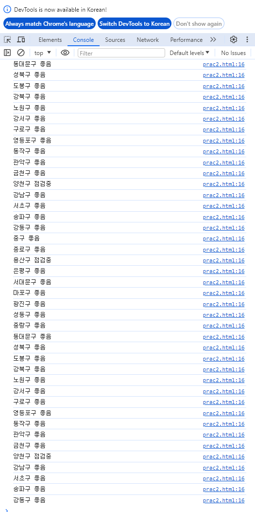 forEach() 반복문 함수를 이용해 원하는 데이터의 형태를 볼수있다
