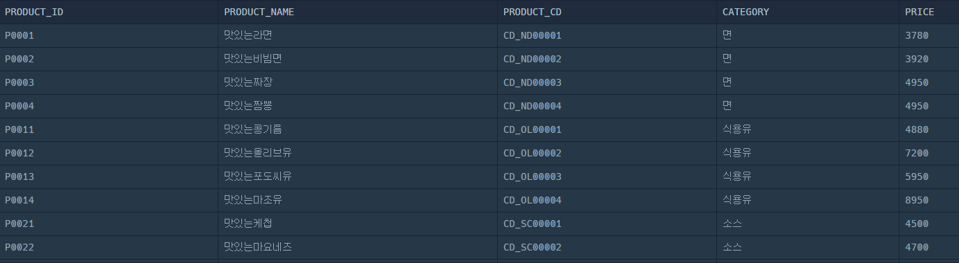 HAVING CATEGORY = '국' OR CATEGORY = '김치' OR CATEGORY = '식용유' OR CATEGORY='과자'