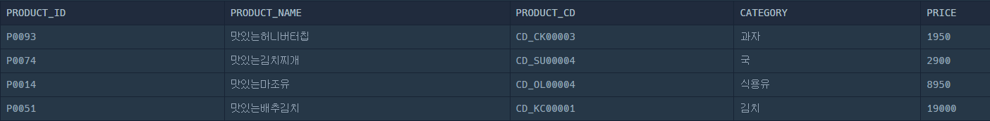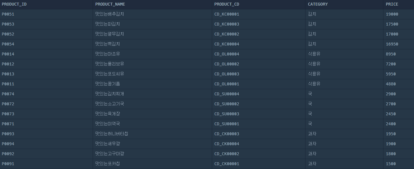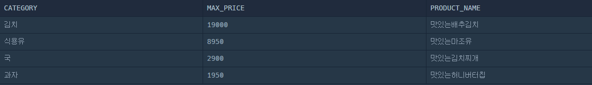 CATEGORY가 김치,국,과자,국인 테이블을 서브쿼리로 넣어서 GROUP BY 로 묶어주게 되면 기존에 생성한 A2라고 이름 붙힌 테이블이 가격순으로 내림차순 정렬이 되어있기때문에 자연스럽게 각 GROUP의 PRICE가 가장 높은 값들이 조회가 된다