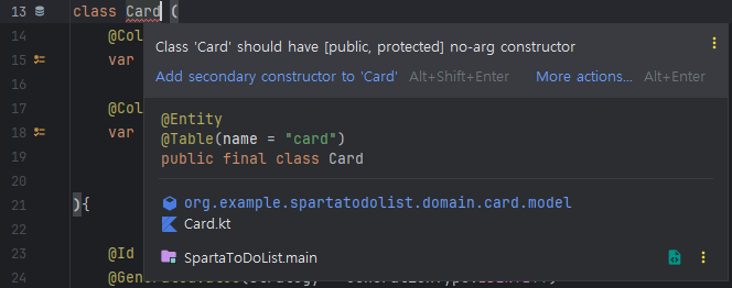 적용을 마친후 Card 클래스에 있던 경고표시가 사라진것을 확인할 수 있다.
