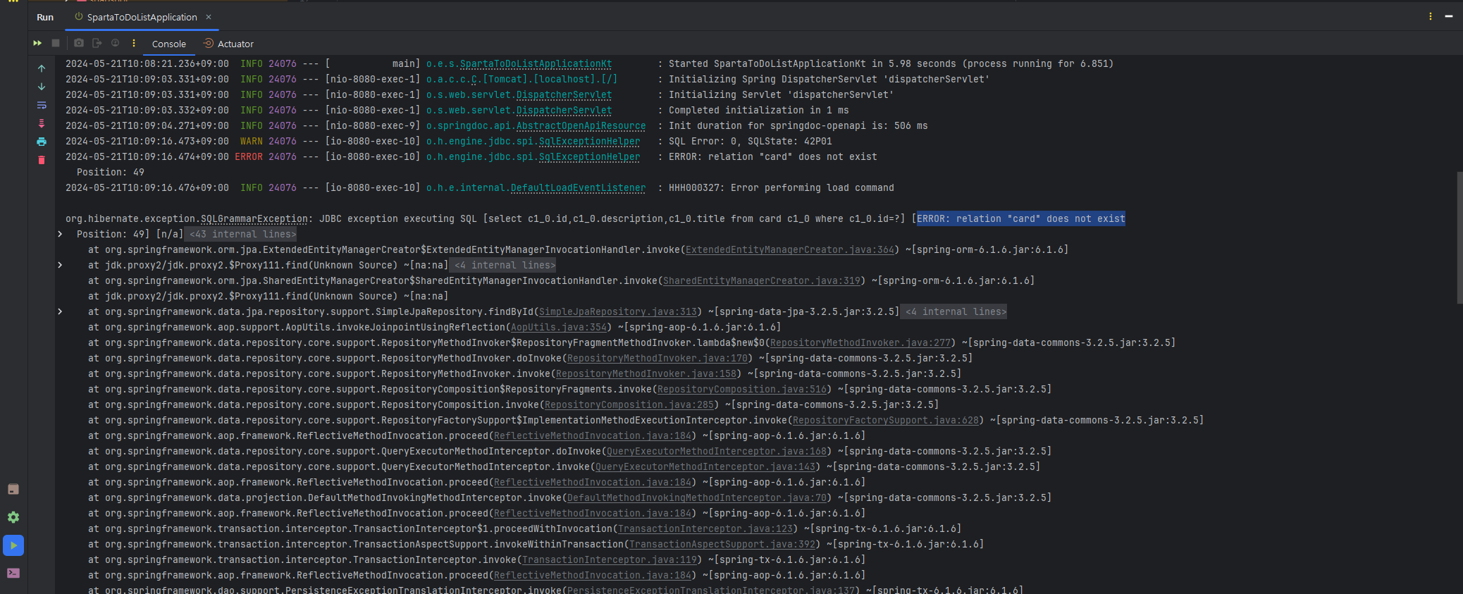 SQLGrammarException 오류 메시지는 현재 데이터베이스에 card라는 테이블이 존재하지 않아서 발생한 오류이다.