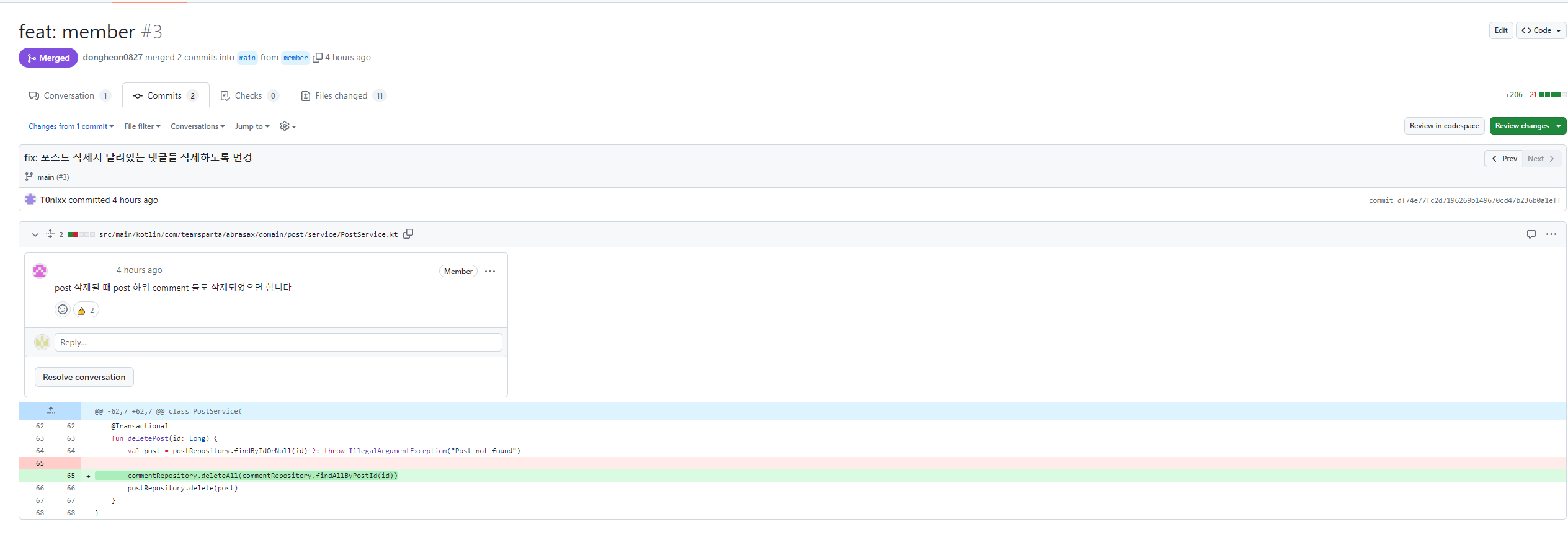 코드리뷰를 통해서 merge하기 전 다른팀원들에게 코드 진행상황을 공유하고 검증을 받음