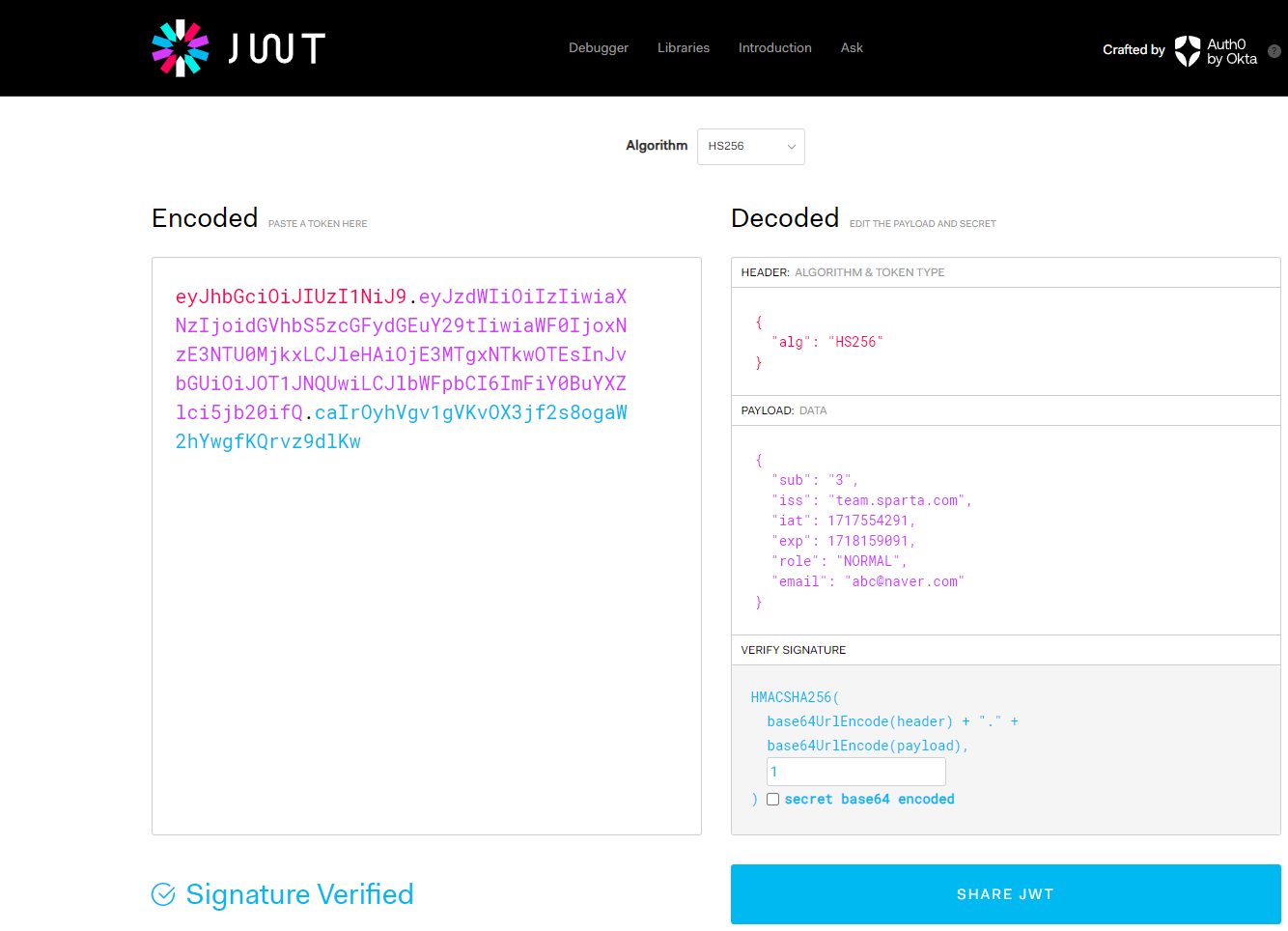 - https://jwt.io/ 사이트를 통해서 내가 생성한 토큰에 정보가 잘 담겼는지 확인할 수 있다.