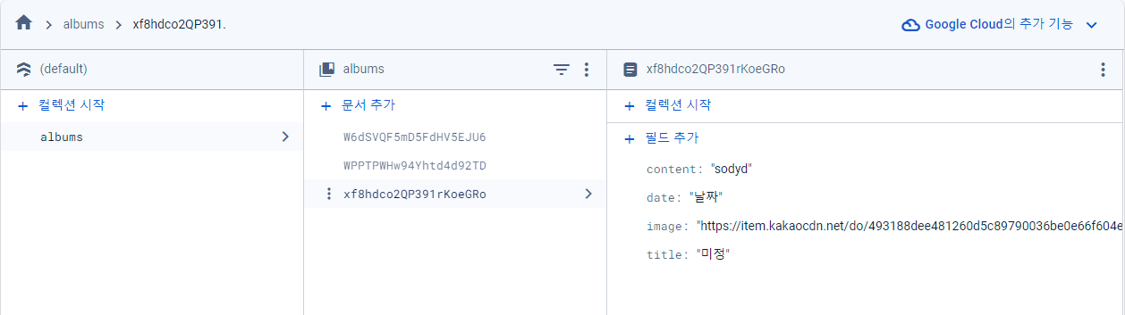 addDOC함수로 데이터베이스에 데이터를 넣었다면 반대로 데이터베이스에서 데이터를 가져오기 위해서 getDOCS함수를 사용 (addDOC함수를 사용할때 albums라는 장소에 데이터를 넣었기 때문에 마찬가지로 albums라는 장소에서 가져와야한다)
