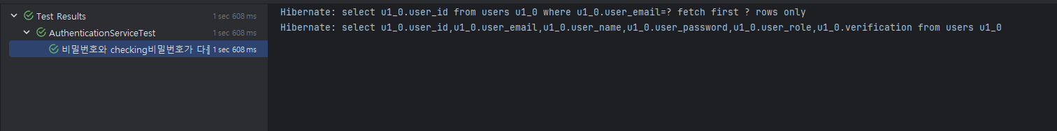 해당 코드를 통해서 처음에 설정한 비밀번호가 다르다면 RuntimeException 예외처리가 발생해야하는데 테스트 단계에서는 예외처리가 발생하지 않는 상황.