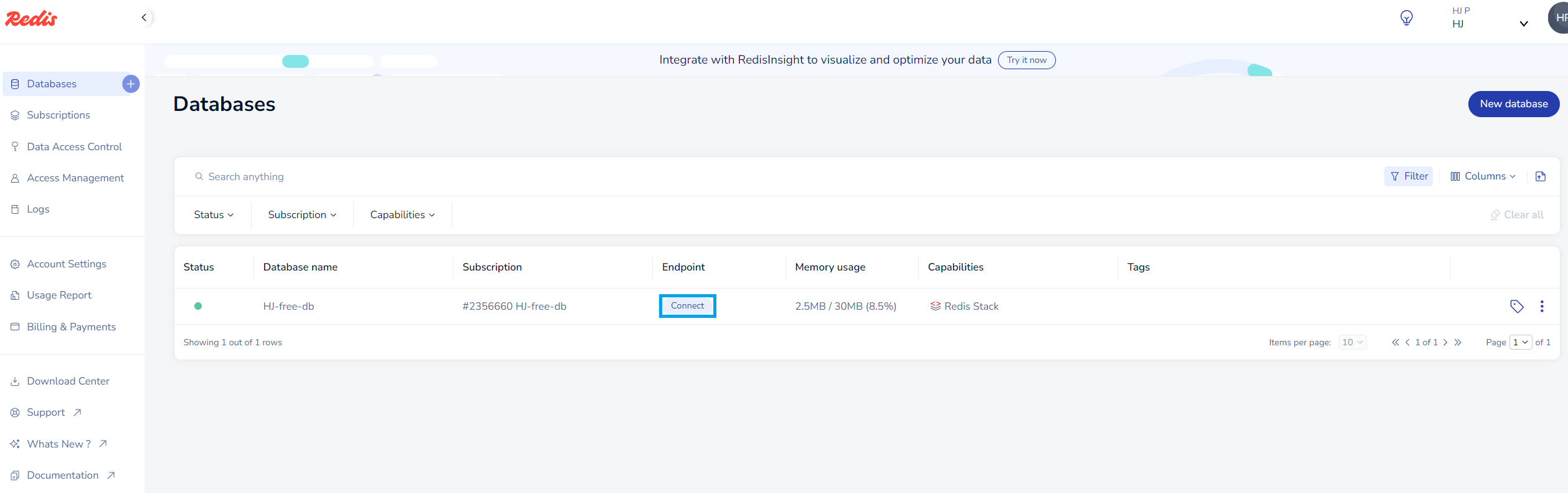 EndPoint의 connect를 눌러서 RedisInsight에 접속한다.