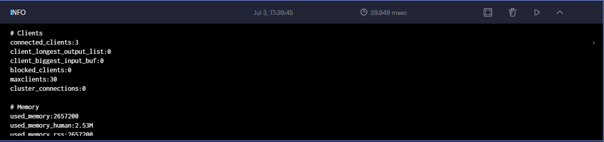 - CLI의 'INFO' 명령어를 통해서 Redis 인스턴스의 메모리 사용량 , 연결 상태, 명령어 처리 속도 등을 확인할 수 있다.
