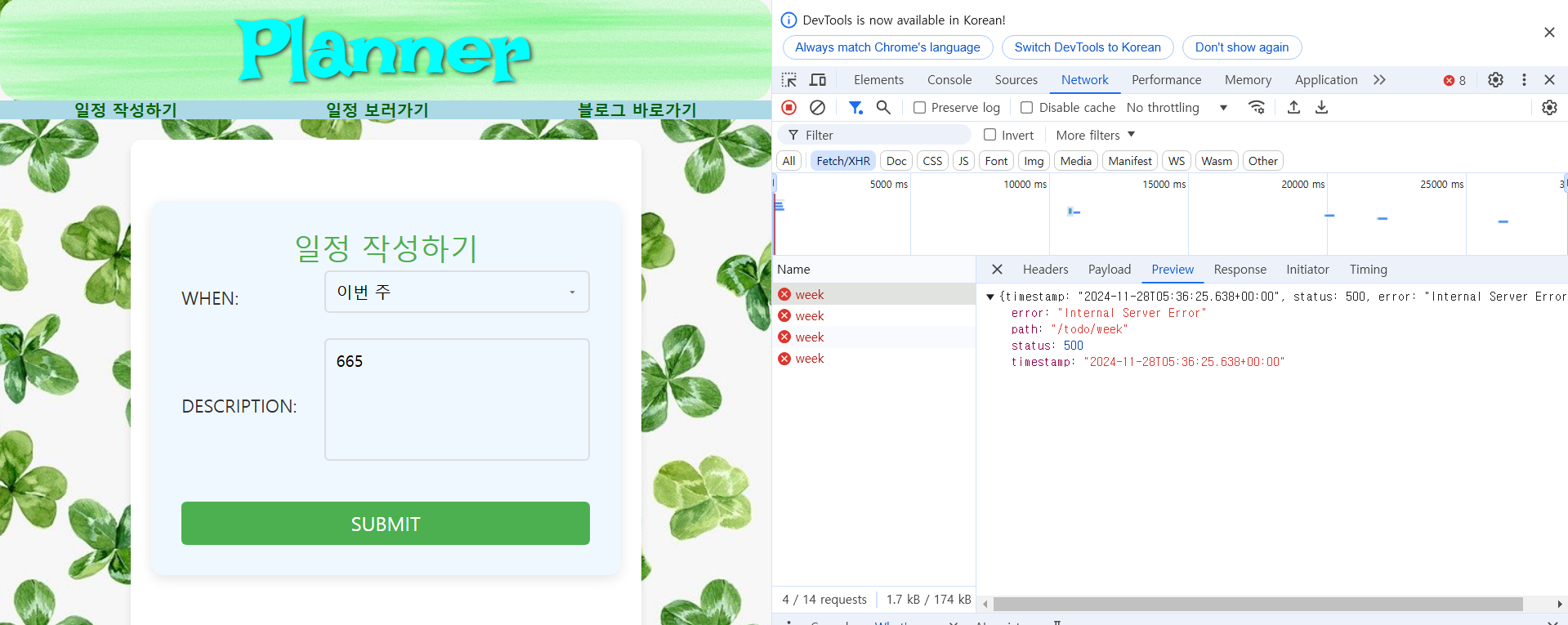 일정 생성시 서버 측에서 오류가 발생하였다.